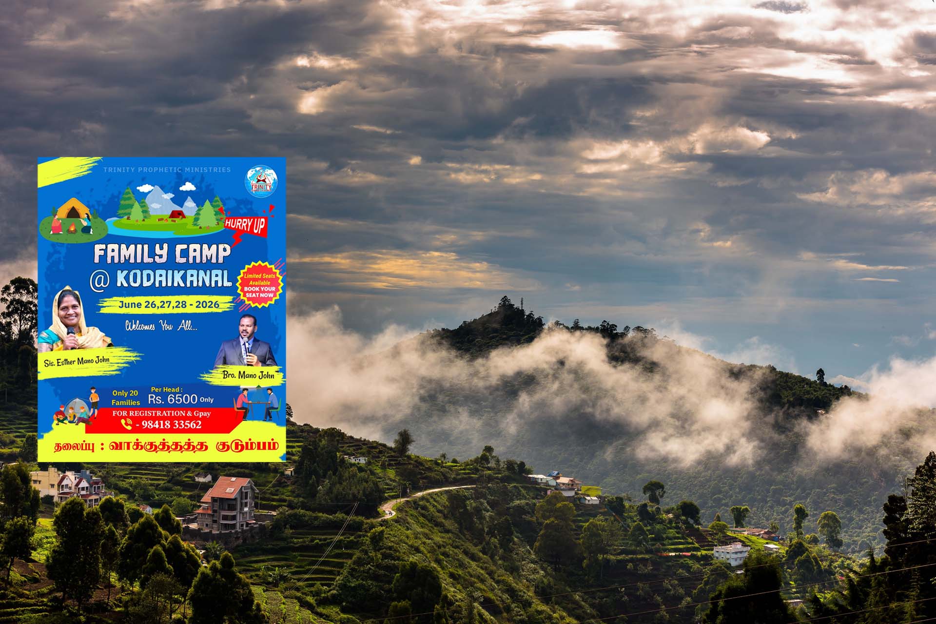 நமது குடும்ப முகாம் வரும் ஜூன் மாதம் 26, 27, 28 நடக்க இருக்கின்றது. முதல் 20 குடும்பங்கள் மட்டும் தெரிந்து கொள்ளப்படுவார்கள். ஆகவே தவறாமல் உடனே முன்பதிவு செய்து கொள்ளும்படி அன்புடன் கேட்டுக்கொள்கிறோம். கர்த்தர் உங்களை ஆசீர்வாதிப்பாராக.
